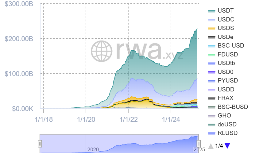 The demand for dollars supported digital tokens has increased in the last two years, the total market of Stablecoin has approached $ 230 billion. Source: Rwa.xyz